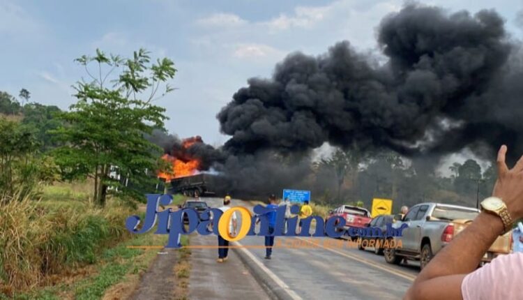 O grave acidente foi registrado na tarde desta sexta-feira (25) na BR-364, em Jaru, sentido a Ariquemes, envolvendo dois caminhões e uma caminhonete. Segundo informações, após uma colisão frontal entre uma carreta, que trafegava sentido a Jaru, e um caminhão do tipo baú, os veículos pegaram fogo. Uma caminhonete Fiat Toro também se envolveu no acidente e ficou com a parte dianteira bastante danificada. Informações dão conta que um dos motoristas dos veículos pesados teria ficado preso às ferragens e morreu carbonizado. O Corpo de Bombeiros foi acionado para tentar conter as chamas.
