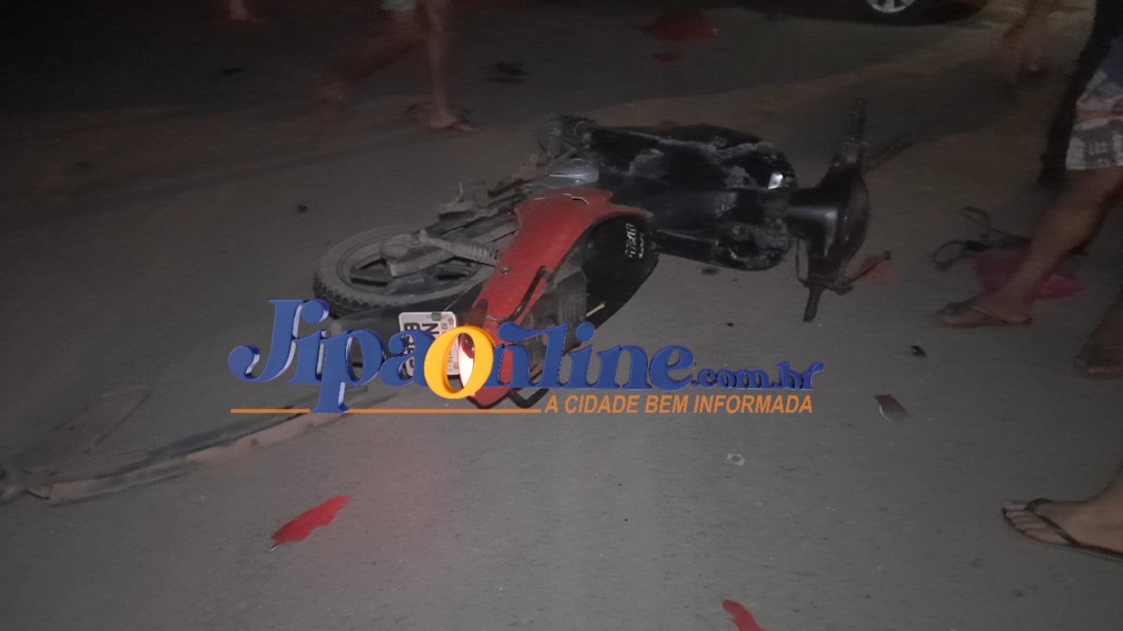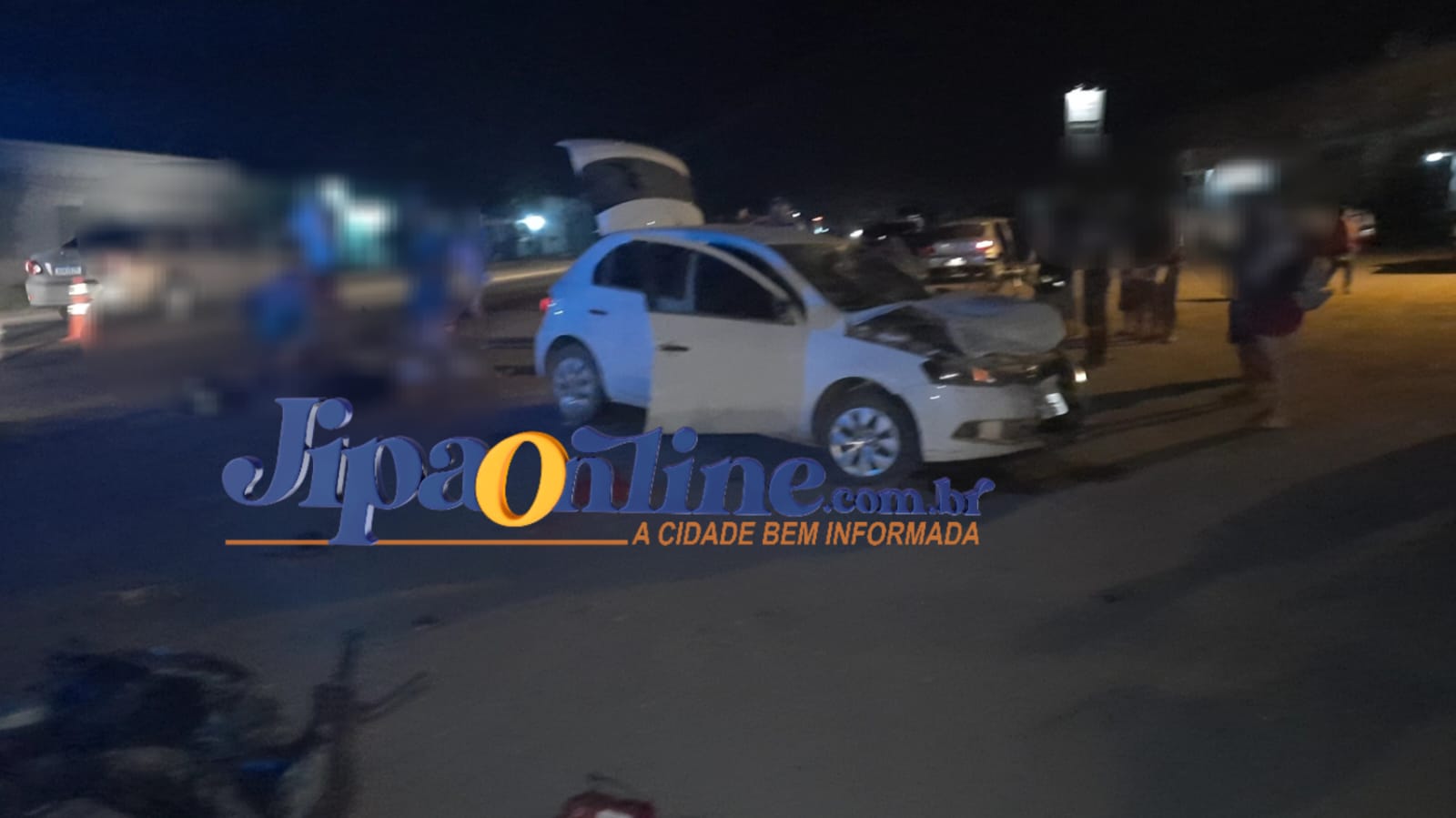 A frente do gol ficou bastante destruída, assim como a motoneta pedaços de carenagem espalhadas pelo chão.