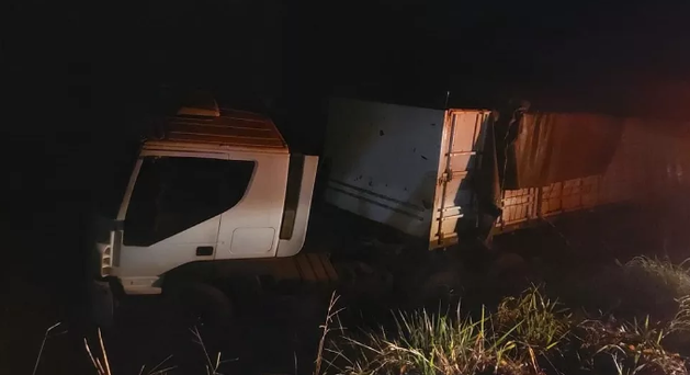 Durante perseguição policial, o caminhão saiu da pista, colidiu com uma cerca e atolou. Motorista conseguiu fugir.