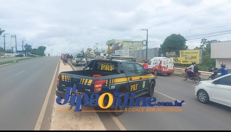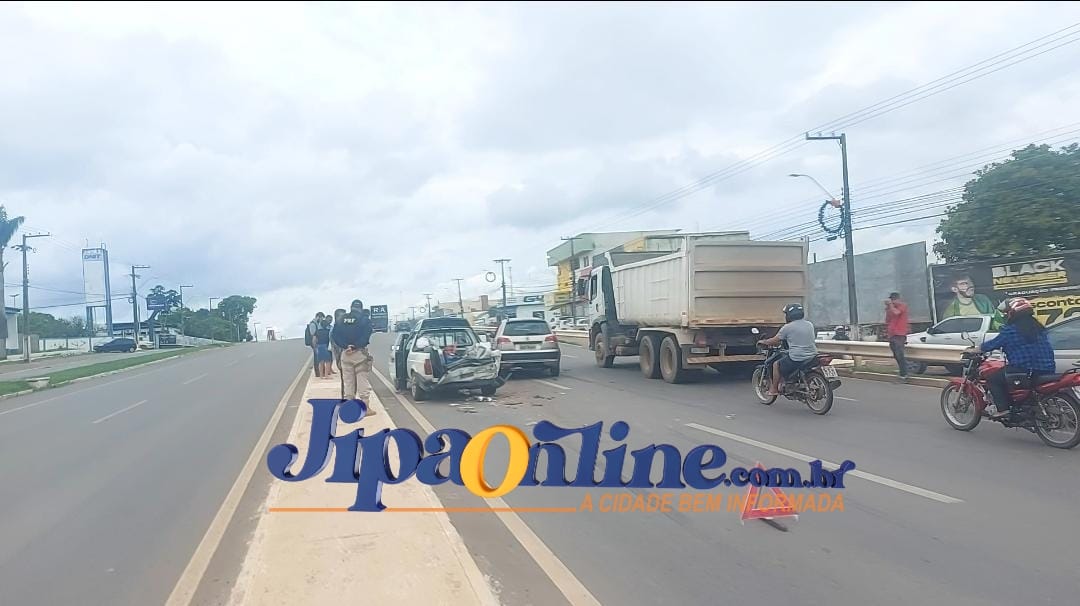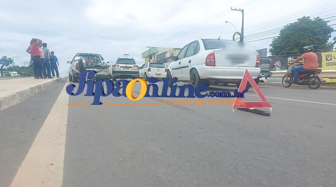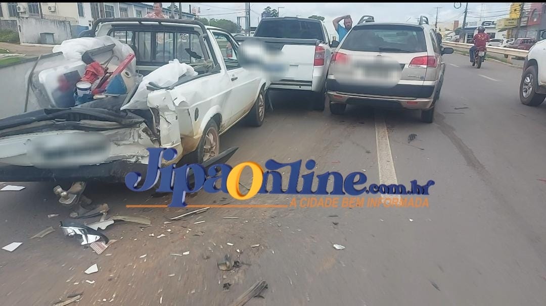 Dois veículos acabaram se chocando na Br 364, em frente a biblioteca municipal, onde um pálio weekend bateu na traseira de um saveiro, que veio também a se chocar com uma pick-up Montana.