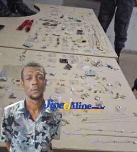Rogério Campos Martins foi preso pela Polícia Militar nas proximidades do terminal rodoviário de Ji-Paraná, portando 179 joias furtadas de uma relojoaria localizada no 1º Distrito. Durante patrulhamento motivado por denúncias de movimentação suspeita ligada ao uso de drogas, os policiais abordaram o suspeito e encontraram com ele uma sacola contendo diversos itens: cordões, pulseiras, anéis, brincos, pingentes, um relógio e uma pulseira de relógio. Também foram apreendidas porções de crack. Todos os objetos foram reconhecidos como sendo da relojoaria que havia sido alvo de furto ainda no mesmo dia. Rogério foi encaminhado à Delegacia da Polícia Civil (UNISP), onde recebeu voz de prisão. Ele permanece à disposição da Justiça.