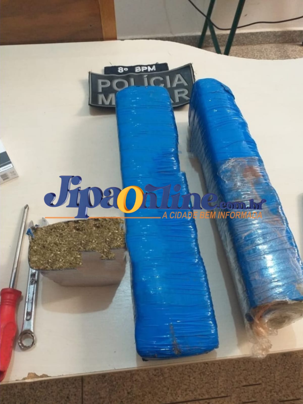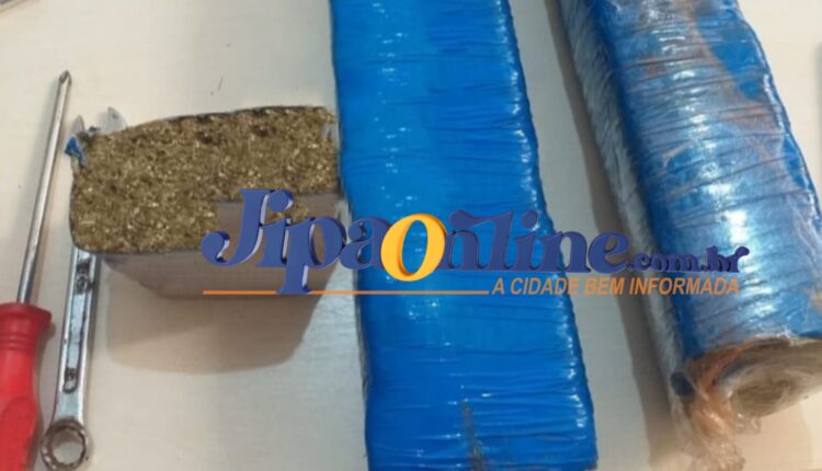Devido à suspeita, os policiais realizaram abordagem ao suspeito, tendo sido encontrado com ele, duas barras grandes e uma pequena de substância entorpecente do tipo maconha, pesando cerca de dois quilos, que estavam embaladas por um plástico de cor azul e acondicionadas dentro de uma bolsa de cor preta que ele tinha em suas costas.