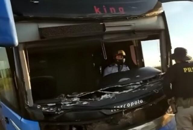 Motorista é flagrado dirigindo ônibus sem para-brisa e usando capacete.