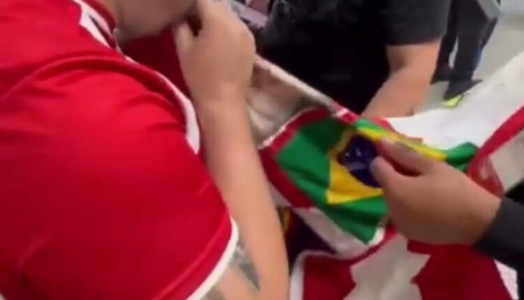 Um torcedor foi proibido pela equipe de segurança do estádio Khalifa, no Catar, de entrar com um adesivo de Lula na sua bandeira. O homem teve que retirar é um amigo gravou a situação.