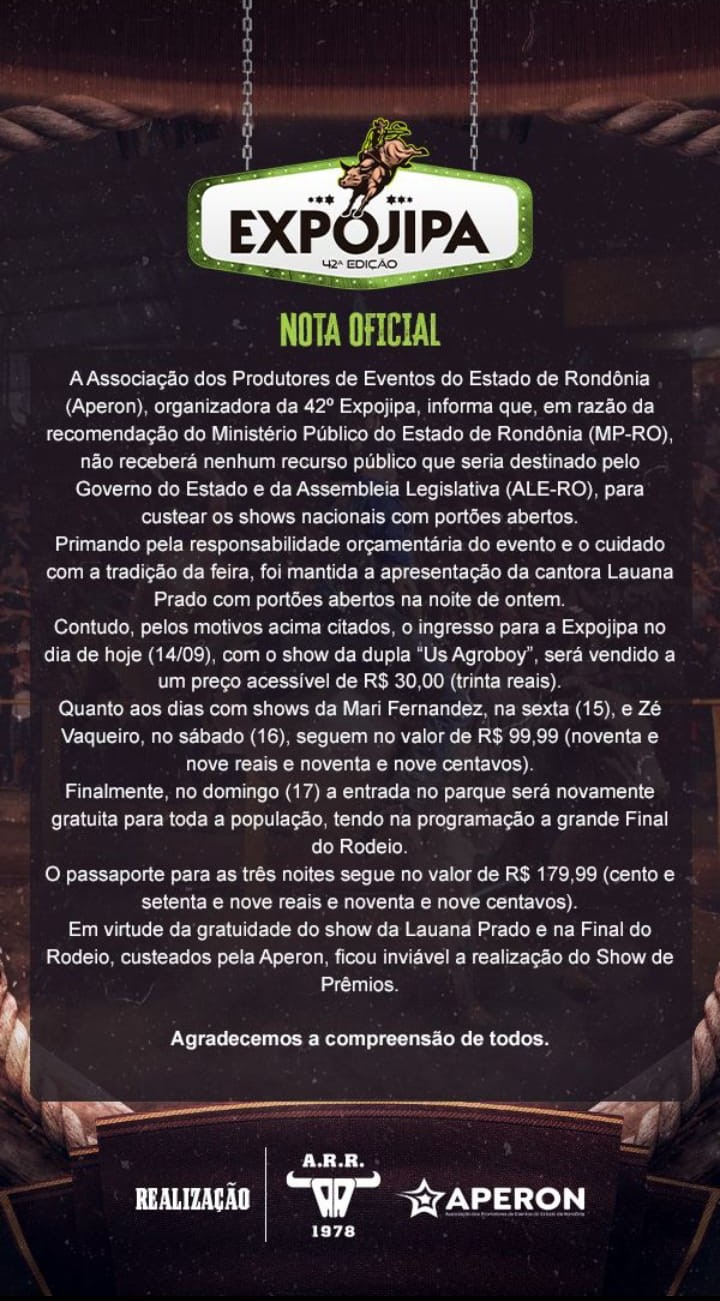 A associação dos produtores de eventos do Estado de Rondônia (Aperon), organizadora da 42ª Expojipa, informa que, em razão da recomendação do ministério público de Rondônia (MP-RO), não recebera nenhum recurso público que seria destinado pelo Governo do Estado e da Assembleia legislativa (ALE-RO), para custear os shows nacionais com portões abertos.
