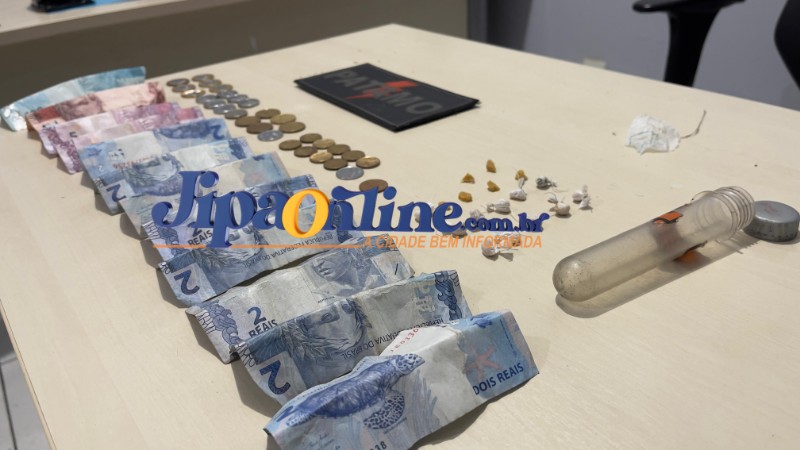 Ao notar a aproximação da viatura, o suspeito, identificado como Alessandro, tentou se esconder no imóvel. Os policiais observaram que ele se agachou e passou a mexer na terra em um ponto específico do local, atitude considerada suspeita e compatível com tentativa de ocultação de material ilícito. Durante a busca pessoal, foi encontrada com o suspeito uma porção de substância análoga ao crack, além de R$ 148,05 em dinheiro, em notas e moedas fracionadas, característica comum em ocorrências de tráfico de drogas. Em seguida, os militares realizaram uma varredura no imóvel e localizaram um buraco com a terra recentemente remexida. Dentro dele, havia um recipiente plástico contendo 17 pedras de crack prontas para comercialização.
