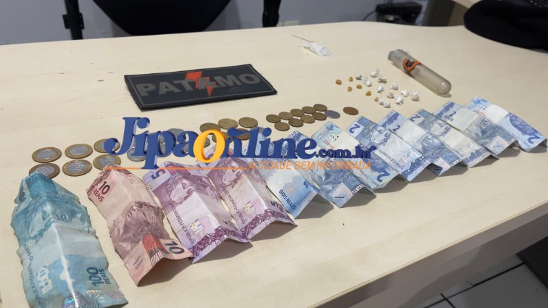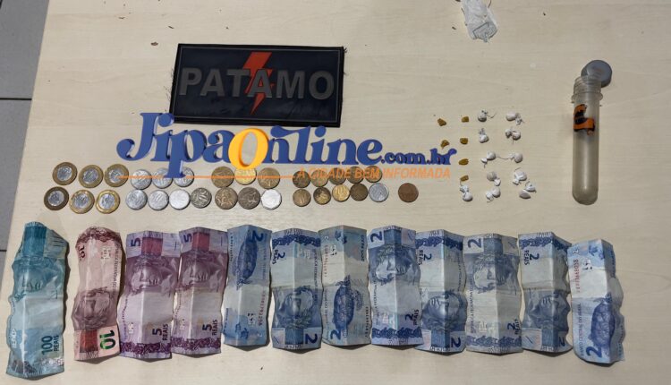 Ao notar a aproximação da viatura, o suspeito, identificado como Alessandro, tentou se esconder no imóvel. Os policiais observaram que ele se agachou e passou a mexer na terra em um ponto específico do local, atitude considerada suspeita e compatível com tentativa de ocultação de material ilícito. Durante a busca pessoal, foi encontrada com o suspeito uma porção de substância análoga ao crack, além de R$ 148,05 em dinheiro, em notas e moedas fracionadas, característica comum em ocorrências de tráfico de drogas. Em seguida, os militares realizaram uma varredura no imóvel e localizaram um buraco com a terra recentemente remexida. Dentro dele, havia um recipiente plástico contendo 17 pedras de crack prontas para comercialização.