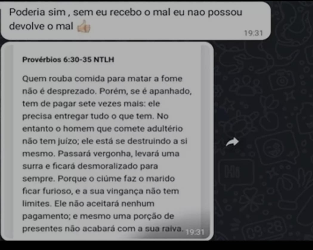 Segundo o empresário, o rapaz enviou uma mensagem que faz referência ao versículo 30 do capítulo 6 dos provérbios bíblicos, que diz: “O ladrão não é desprezado se, faminto, rouba para matar a fome”.