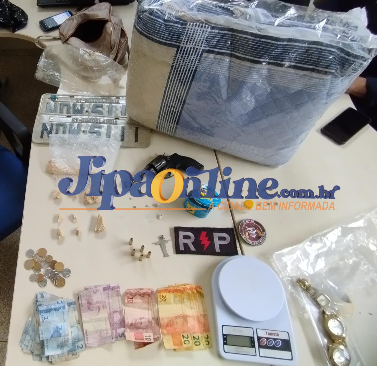 Ao iniciar a incursão na casa, uma mulher correu para o interior do imóvel, levantando suspeita. A mulher ao ser abordada estava com um pote contendo várias pedras de crack; ainda em revista minuciosa no interior do imóvel, foi localizado uma arma de fogo calibre 38 municiada, e mais pedaços grandes de pedras de crack, fracionadas. Haviam cerca de 130 pedras, balança de precisão, e produtos a serem comprovados a procedência.