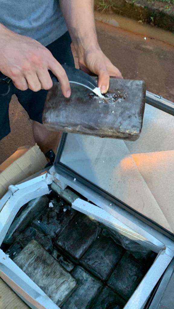 Durante as buscas, os policiais encontraram apenas duas caixas térmicas no, porta malas do veículo, contendo polpa de frutas congeladas. Os militares perceberam haver algo estranho, notando um fundo falso nas caixas. Quando fizeram um corte, saiu um pó branco, confirmando a denúncia sobre o carregamento de droga.
