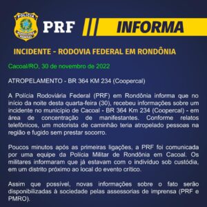 A Polícia Rodoviária Federal (PRF) em Rondônia informa que no início da noite desta quarta-feira (30), recebeu informações sobre um incidente no município de Cacoal – BR 364 Km 234 (Coopercal) – em área de concentração de manifestantes. Conforme relatos telefônicos, um motorista de caminhão teria atropelado pessoas na região e fugido sem prestar socorro.