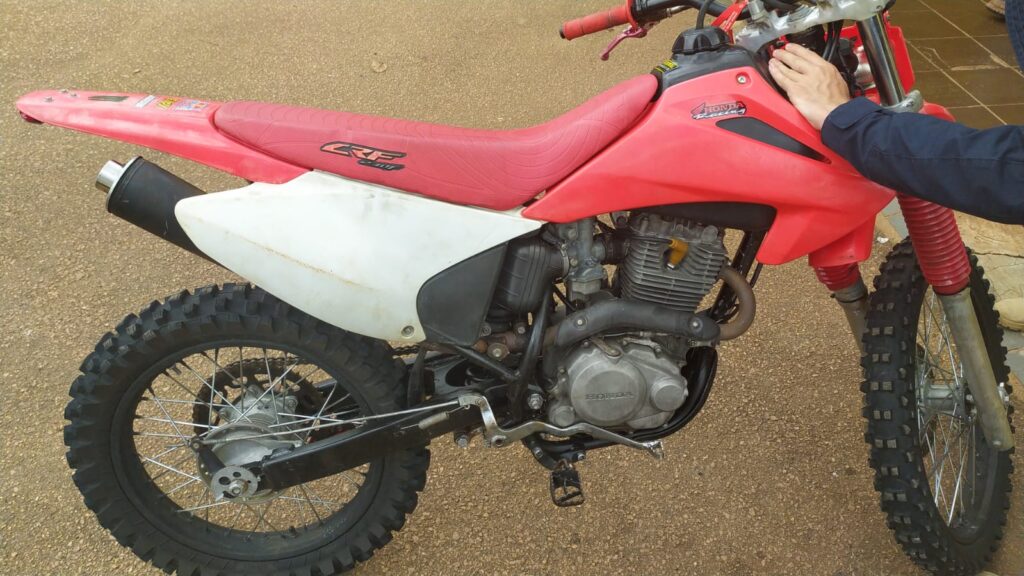 Na primeira ocorrência, registrada às 11h30, próximo ao trevo do Roque (Km 713) a equipe policial constatou que uma moto HONDA/CRF230F, transportada no compartimento de carga de uma caminhonete, estava com os elementos identificadores de segurança adulterados. O infrator, após ser questionado, não soube explicar o fato e tampouco apresentou documentações do referido veículo.