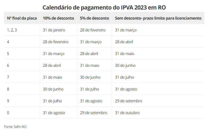Porto Velho, RO – O governo de Rondônia divulgou o calendário completo para pagamento do Imposto sobre Propriedade de Veículos Automotores (IPVA) em 2023.