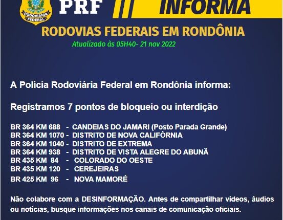 Balanço divulgado pela Polícia Rodoviária Federal (PRF) por volta das 05h40, desta segunda-feira (21), detalham 07 pontos de bloqueio total em rodovias federais no estado, a maioria na BR-364. Os bloqueios são esses: