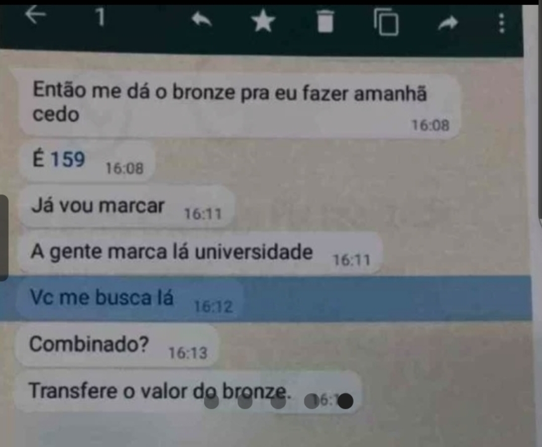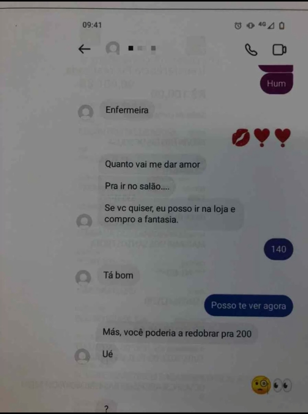Em uma das conversas colhidas pela polícia, a mulher diz: “Então me dá o bronze para eu fazer amanhã cedo. É R$ 159. Já vou marcar. Transfere o valor do bronze.” As mensagens são seguidas pelo número de CPF para a transferência via PIX. Numa outra troca de mensagens, a jovem pergunta quanto o rapaz irá lhe dar para ir ao salão. “Se você quiser, eu posso ir na loja e compro a fantasia”, escreve. O homem responde que irá dar R$ 140, e ela acrescenta: “Mas você poderia redobrar para R$ 200”.